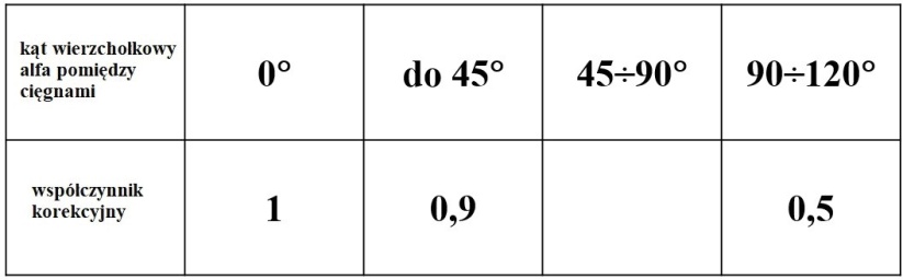 - dopuszczalne obciążenie robocze cięgna przy kącie wierzchołkowym alfa 120°